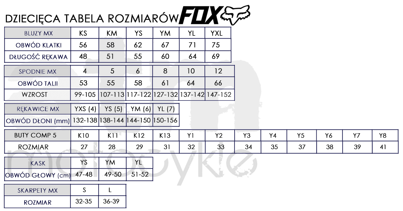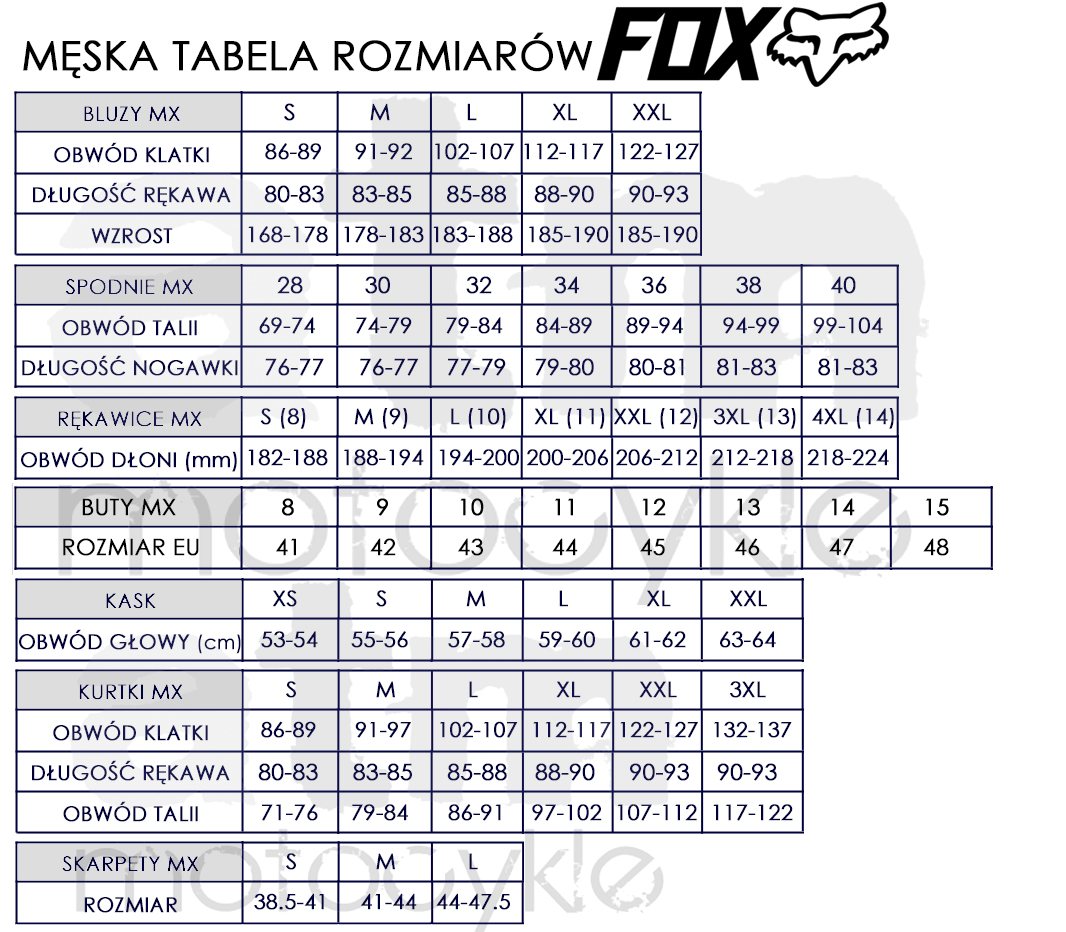 FOX - tabela rozmiarów