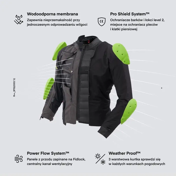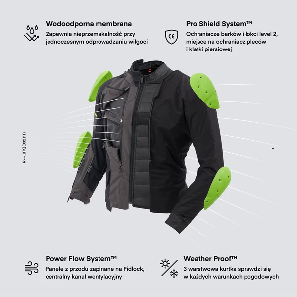 O Twoje bezpieczeństwo dbają ochraniacze (barków i łokci), odblaskowe elementy oraz wzmocnienia newralgicznych stref z materiału Hitena® Dobby Balistic 1000D. Położenie ochraniaczy łokci możesz dopasować idealnie do siebie, a dzięki temu zyskujesz jeszcze skuteczniejszą ochronę.