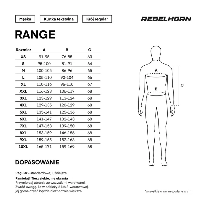 | Rozmiar | Obwód klatki piersiowej (cm) | Obwód w talii (cm) | Długość rękawa (cm) |