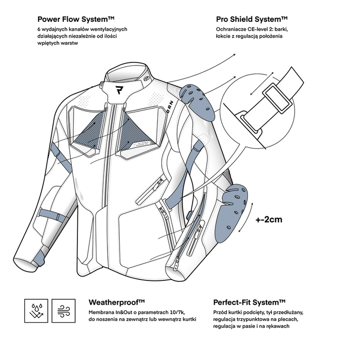 - Wypinana membrana membrana In & Out HydraShield o właściwościach wodoodpornych na poziomie 7000 mmH20 i przepuszczalności powietrza na poziomie 10000 g/m2/24h,