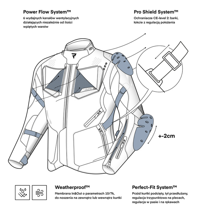 - 2 duże otwierane panele wentylacyjne na przedniej części kurtki