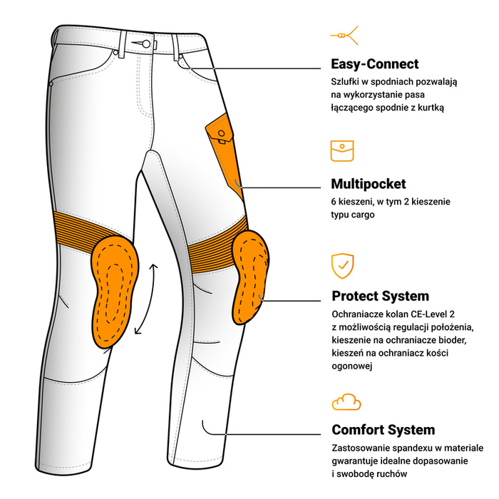 - Elastyczne wstawki w obszarach narażonych na naprężenia poprawiają komfort użytkowania i swobodę ruchów.