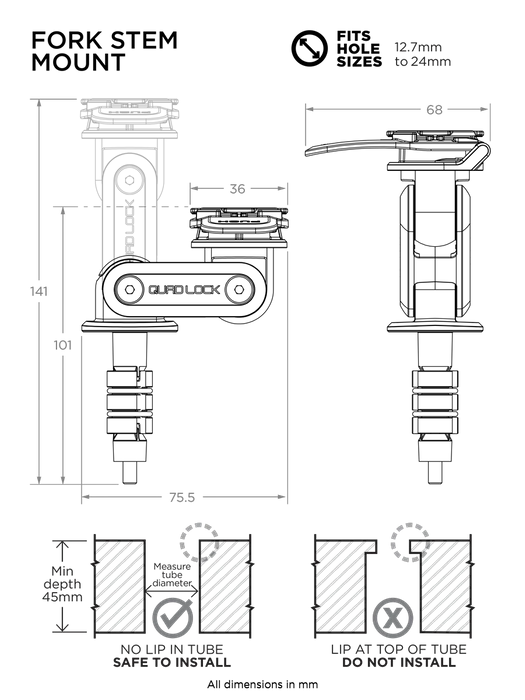 Podstawa montowana w sztycę główki ramy Quad Lock jest przeznaczona do motocykli, w których wymagany jest montaż w rurze sztycy widelca.