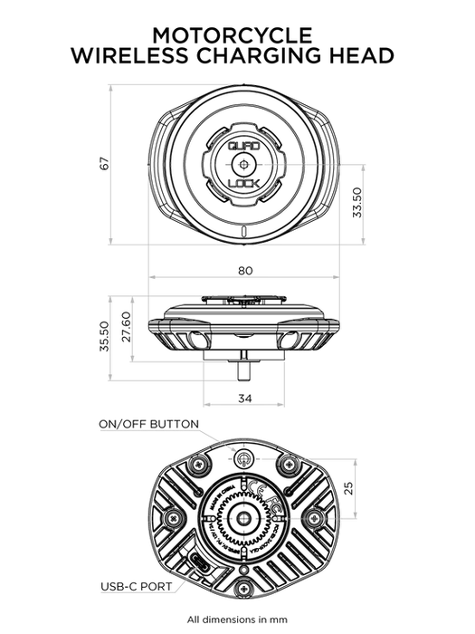 Głowica z ładowarką indukcyjną Quad Lock® USB zawiera kable do bezpośredniego ładowania ze źródła zasilania USB motocykla. W przypadku motocykli bez gniazda USB, zastosuj inteligentny adapter Quad Lock® 12V na USB, który można podłączyć do akumulatora motocykla.