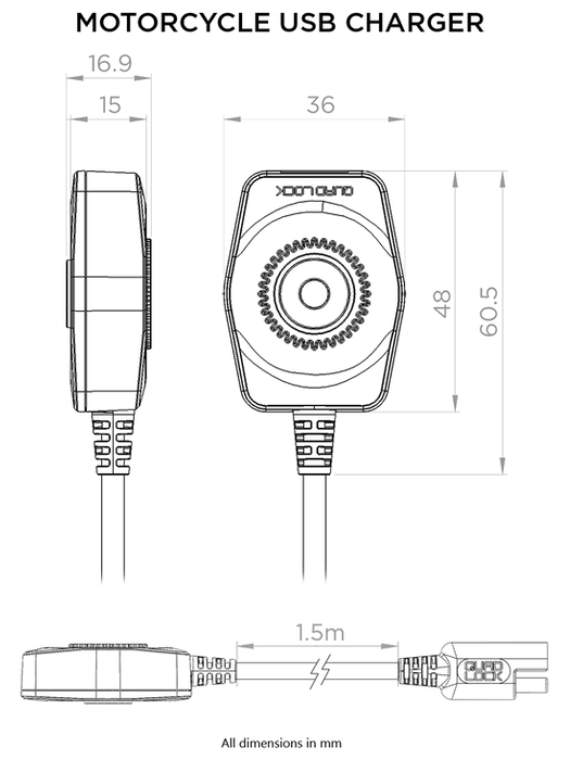 Bezproblemowo zainstaluj motocyklową ładowarkę USB z dowolnym uchwytem motocyklowym Quad Lock® lub adapterem kulowym 1". Ładowarka jest starannie umieszczona pod głowicą mocującą Quad Lock®, co zapewnia zasilanie USB bez potrzeby stosowania długich kabli ładujących. Kabel połączeniowy SAE o długości 1,5 m oraz zaciski pierścieniowe SAE do akumulatora o długości 20 cm umożliwiają podłączenie bezpośrednio do akumulatora lub istniejącego portu SAE. Ładowarka nie pobiera prądu, gdy nie jest używana, co eliminuje ryzyko rozładowania akumulatora.