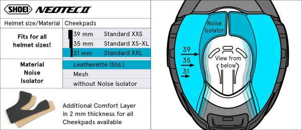 Ergonomiczna, trójwymiarowa konstrukcja zapewnia, że wkładki ściśle przylegają do policzków, co gwarantuje stabilne dopasowanie kasku, nawet przy dużych prędkościach. Twarde, ale wygodne wkładki, które idealnie przylegają do policzków i podbródka, dodatkowo redukują przeciągi i znacznie zmniejszają hałas.