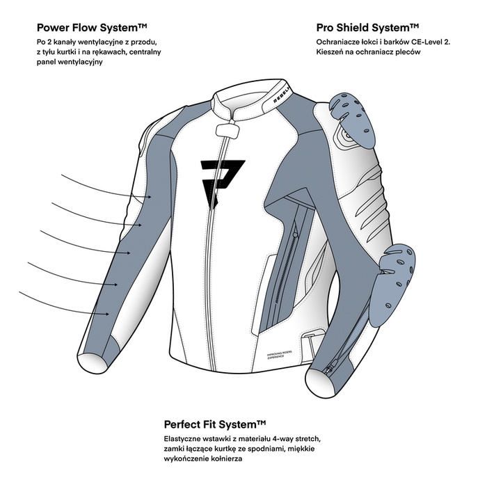 - zamki łączące (360°, i kró,tki), dzięki któ,rym zepniesz kurtkę z dowolnymi spodniami marki Rebelhorn