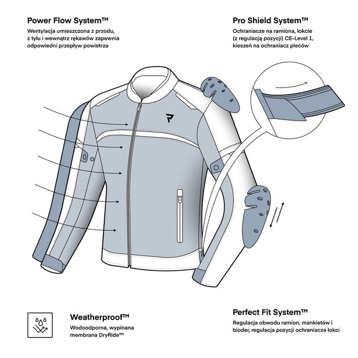 - Membrana wodoodporna DryRide™: Wypinana, idealna na deszczowe dni