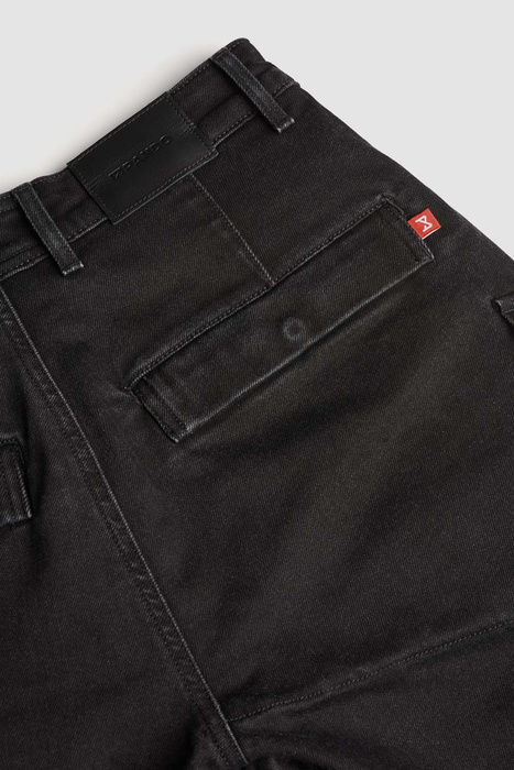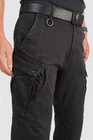 Krój typu cargo z wysokim stanem i podwójną warstwą materiału nadaje spodniom klasyczny wygląd oraz praktyczny charakter. Duże kieszenie na udach i z tyłu, zamykane na zatrzaski, zapewniają sporo miejsca na najpotrzebniejsze rzeczy.