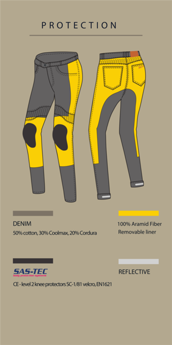 - Warstwa zewnętrzna – Denim: 50% bawełna, 30% Coolmax, 20% CorduraDenim to tkanina tak kultowa, że nikomu nie trzeba jej przedstawiać. Noszona przez ludzi w każdym wieku, na całym świecie. Nic więc dziwnego, że posłużyła do stworzenia spodni motocyklowych – daje w końcu pewność, że będą wygodne i bezpieczne. Tak jak materiał, z którego zostały wykonane. Dzięki użyciu materiału Coolmax jeansy będą przewiewne i komfortowe, natomiast Cordura, materiał o bardzo wysokiej odporności, da Ci gwarancję bezpieczeństwa na trasie.