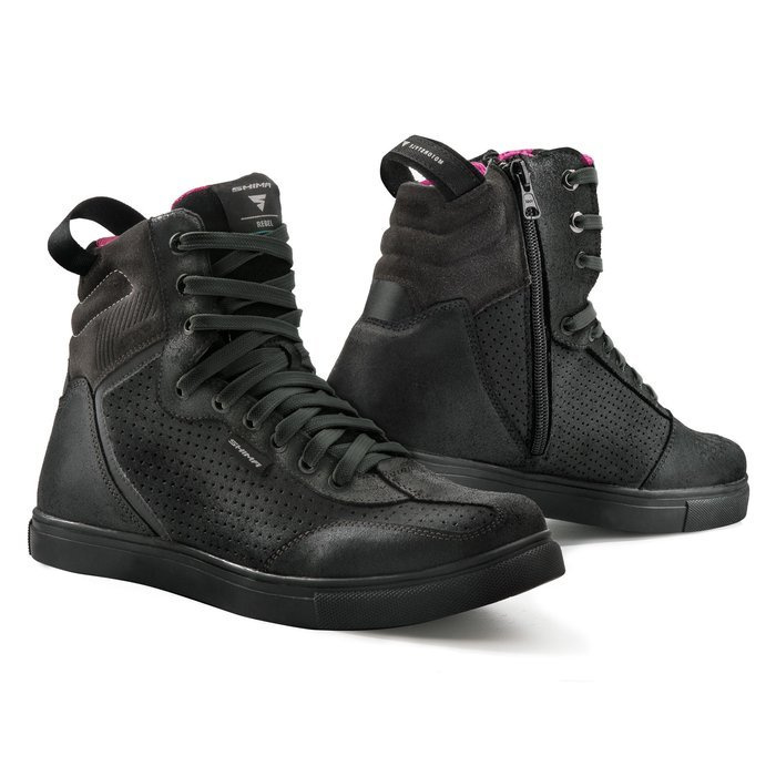 Trampki REBEL WP Lady zostały wykonane z uwzględnieniem kobiecego dopasowania oraz ze specjalną pochyloną konstrukcją dostosowaną do pozycji motocyklisty. Aby zapewnić jeszcze większy komfort podczas jazdy, w strefie palców użyto przetłoczeń z antypoślizgowego materiału tak, aby wspomagać zmianę biegów. Pozwala to z łatwością kontrolować dźwignię zmiany biegów i pozostać skoncentrowanym na drodze podczas jazdy. REBEL WP Lady wyposażono również w panele odblaskowe dla lepszej widoczności po zmroku. System Night Vision jest wykonany w technologii mikrosferycznej, a panele odblaskowe zostały dyskretnie umieszczone w strategicznych miejscach.