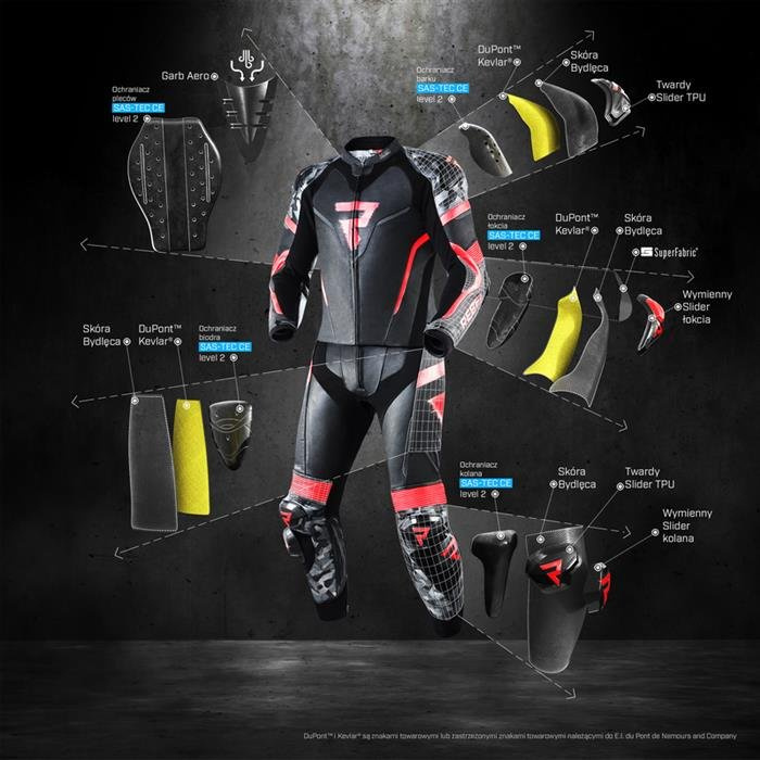 - Warstwa zewnętrzna: Najwyższej jakości skóra bydlęca, 4-way nylon stretch Warstwa wewnętrzna: poliester mesh, Spandex, 60% DUPONT™ KEVLAR® aramid fiber; 40% poliester