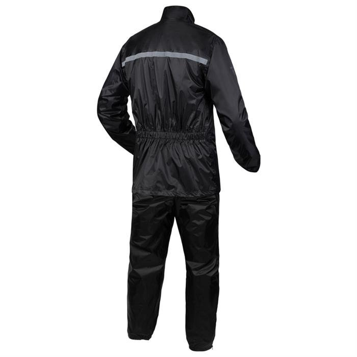 Dwuczęściowy kombinezon przeciwdeszczowy wykonany z poliestru. Posiada laminowane szwy zapobiegające przeciekaniu. Dla zwiększenia bezpieczeństwa zastosowano odblaskowe wstawki na ramionach. Ściągacze na nogawkach, nadgarstkach i w pasie zapewniają wygodne dopasowanie. Podszewka z siatki.