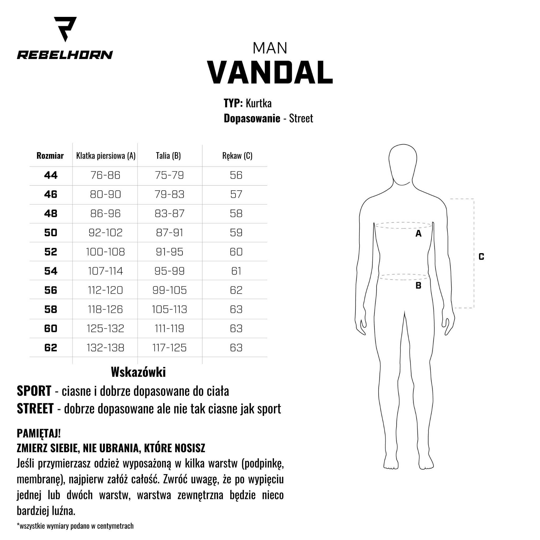 | Rozmiar | Obwód klatki piersiowej (cm) | Obwód w talii (cm) | Długość rękawa (cm) |