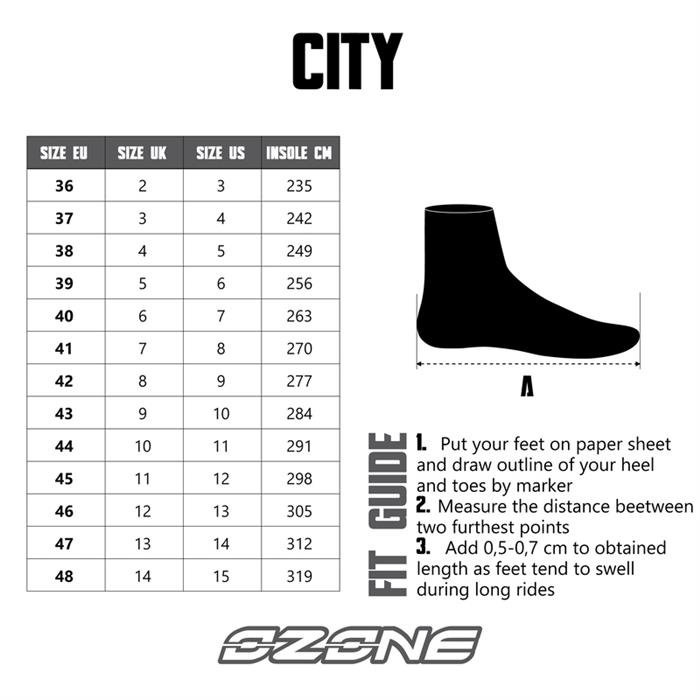 Krótkie, miejskie buty motocyklowe – Ozone CITY. Będą odpowiednim uzupełnieniem stylówki na motocykl typu naked lub klasyk. Posiadają wygodne sznurowania oraz zapięcie na rzep i zamek – dla wygody zakładania. Ochraniacze kostki i wzmocnienie pod dźwignię zmiany biegów, olejoodporna i antypoślizgowa podeszwa sprawiają, że buty Ozone City są bezpieczne. MATERIAŁ