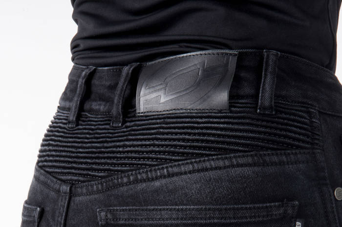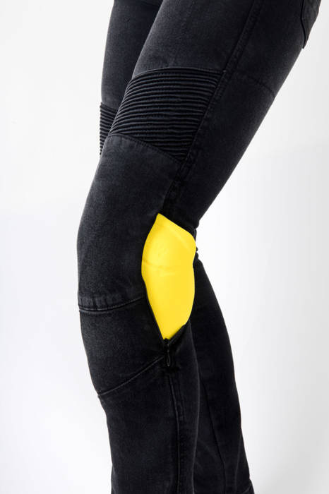 Motocyklowe spodnie jeansowe damskie mają elastyczne wstawki nad kolanami, zapewniające swobodę ruchów. Wyposażone są w ochraniacze kolan CE Level 2, które można wyciągnąć z zewnątrz, bez konieczności ściągania spodni. Na biodrach wszyto kieszenie, w których można umieścić dodatkowe ochraniacze. Materiał