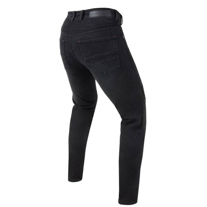 Bezpieczeństwo zapewniają aramidowe panele na biodrach, w pasie oraz kolanach, sięgające aż do połowy kości piszczelowej, a także ochraniacze renomowanej marki SAS-TEC®. Jeansy są zgodne ze standardami CE i posiadają klasę ścieralności AA.